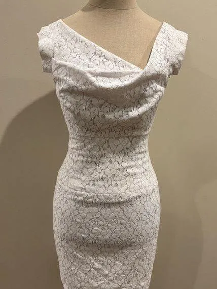 The ever famous, no longer sold Jackie O Mini Lace Sheath Dress. This elegant white lace dress is perfect for any occasion. Its sophisticated design offers a flattering fit and timeless style.