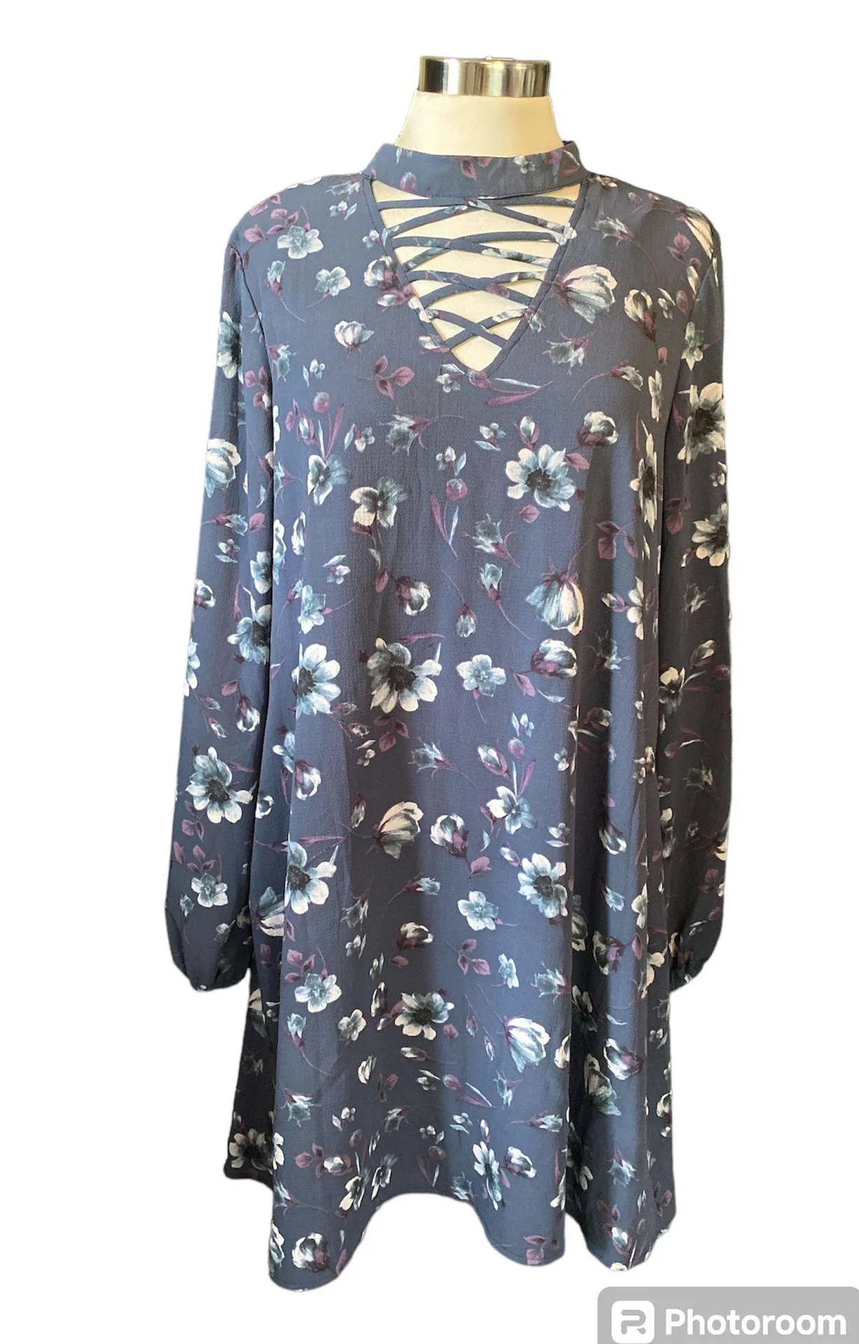 Andree by Unit brand Dress High neckline with 2 buttons in back Keyhole openings in front and back. Front has strips of material crisscrossed Full lining Long sleeves with elastic at wrists Pockets Knee length Floral print Blue with white, purple, black colors Size large EUC Measurements are approximate 25” Pit to bottom 35.5” Top to bottom 23” Across bottom 21” Pit to pit 24.5” Sleeve length Smoke/pet free home
