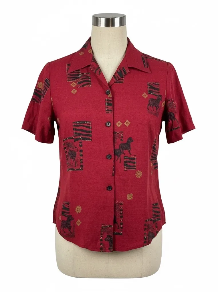 Burgundy, Deep Red, Ruby Red, Black, Gold Print, Zebra Print, Animal Print, Safari Print, Tribal, Geometric, Block Print, Button-Down, Camp Shirt, Bowling Shirt, Cuban Collar, Collared, Short Sleeve, Boxy Fit, Casual, Retro, Vintage, 90s Fashion, Nineties, Dress Barn, Made in USA, Medium, Boho, Bohemian, Summer, Travel, Resort, Statement, Unique