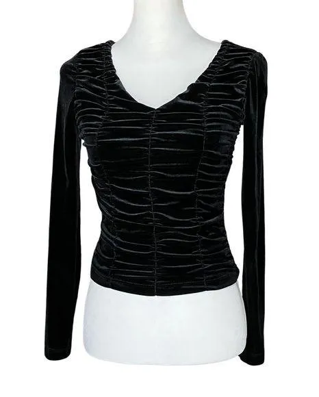 Black velvet going out top with a lot of ruching by Tete a Tete from the 1980s or 90s. Three-quarter sleeves, v neck, and slightly cropped silhouette. Ruched in the front but not the back. Gothic or whimsigoth vibe that could also skew punk with the right styling. Super versatile. In excellent condition without visible flaws. Velvet fabric is very plush. Size and fabric/care tags were cut out but measures to be a modern xs. Double check your measurements below. Approximate measurements when laid flat: Pit to Pit: 15” Waist: 12.5” Length: 18” Sleeve: 28.5” *The ruching allows for some additional stretch. whimsigoth, gothic, goth, vampy, punk, vamp, whimsygoth, emo, velvet, ruched, festival, going out top, layering, concert, lolita