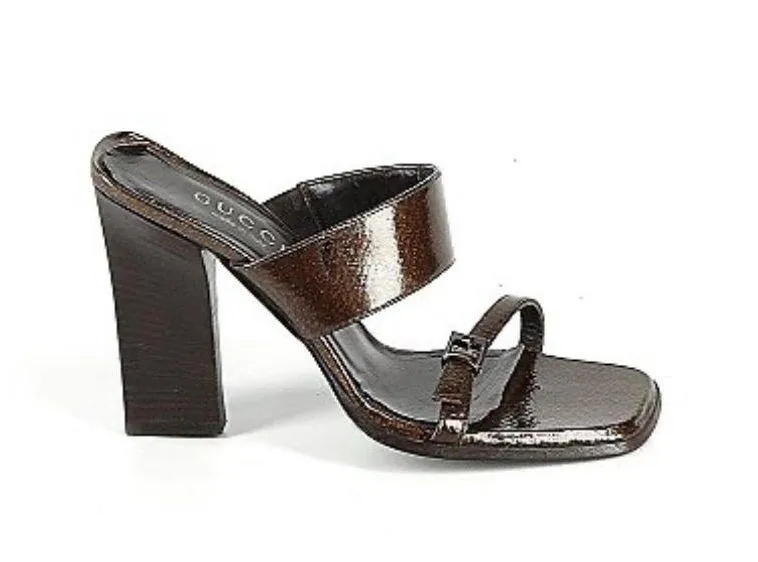 Size: 7.5 B Color: Golden Bronze Patent leather Thick strap and think buckle strap Wooden block heel... Show more