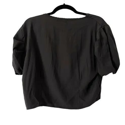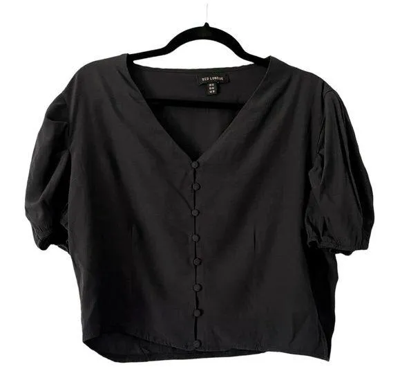 QED London Black Button Front Short Puff Sleeve Crop Top. Lightweight with gathered puff short sleeves and fabric covered buttons. Womens size 10 No rips, holes or stains! Measurements Chest 20” Waist 19” Length 18”