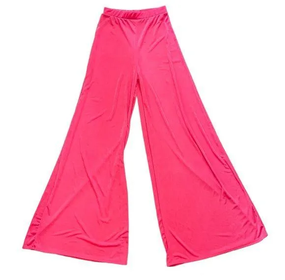 Y2K Pink Flare Pants Sz Medium (fit like a S/M) Bright pink Shimmer Semi sheer Wide leg flare Pull on trouser Stretchy waistband Long inseam Magia usa Preowned sold as is Minor pulls Y2K Barbie Boho Bohemian Western Chic Trendy Blogger Spring Summer Cottagecore Lagenlook Peasant Babydoll