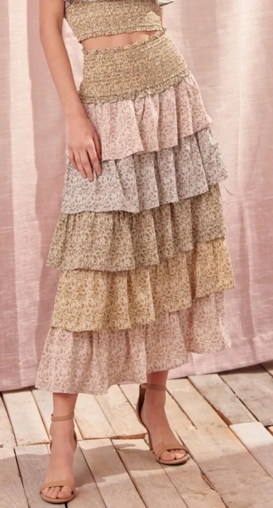 New, (Skirt Only) Storia Color Block Tiered Maxi Skirt Floral Smocked Waist Olive Multi Lined. Cotta... Show more