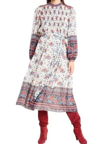 Fabrics : Mixed Silk Voile Details : Flowery print, Dobby spot, Wrinkled collar, High collar, Bishop sleeves, Tightened cuffs, removable belt, Button back, Drop at the neckline, Ties, Midi length, Shirtfront, Pleated, Flared cut, Transparence, Layered Folds Size of photographed item: Size S Length : 115 cm Sleeve length: 60 cm The model is 177cm tall, and wears the item in size S