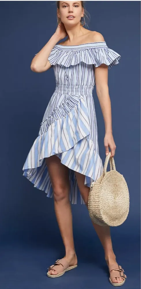 Beautiful and timeless, the Misa Los Angeles Riley Dress features a classic blue and white striped design with feminine ruffle trim. The off-shoulder neckline and asymmetrical ruffle hem add a flirty, breezy silhouette perfect for summer parties, vacations, or brunch dates. Crafted in the USA from a lightweight cotton-blend fabric with a touch of stretch for comfort and movement. Details: • Brand: Misa Los Angeles • Style: Riley Dress • Size: Small • Color: Blue & white stripe • Off-shoulder neckline with elastic ruffle trim • Smocked waistline for a flattering fit • Asymmetrical ruffle skirt • Material: 97% Cotton, 3% Spandex; Contrast: 90% Cotton, 10% Linen • Made in the USA • Pull-on style • MSRP: $298 Condition: Excellent preowned condition. No visible flaws or stains. Coastal chic, resort wear, brunch outfit, summer wedding guest dress, beach vacation, Anthropologie style, romantic ruffles, classic stripes, blue and white dress, feminine silhouette Misa Los Angeles Riley dress, off shoulder ruffle dress, striped cotton dress, blue and white summer dress, asymmetrical hem dress, made in USA designer dress, resort vacation outfit, romantic boho chic dress, coastal style, Anthropologie ruffle midi dress