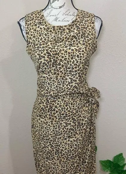 Dress by Maggy London Features: Sexy & Classy Leopard Print Solid top with a full Wrap Skirt High Scoop Neck Sleeveless Maxi Length Zipper Back 100% Silk !!!! Measurements taken laying flat Bust 18 - 19 in Waist 13 - 15 in Hips 18 - 19 in Length 54 in If you love this send me an offer or bundle for discounts Leopard Print, Animal Print, Boho, Office Chic to Beach Babe, Classy Leopard Cat Holiday Christmas Party Dress Tiger King