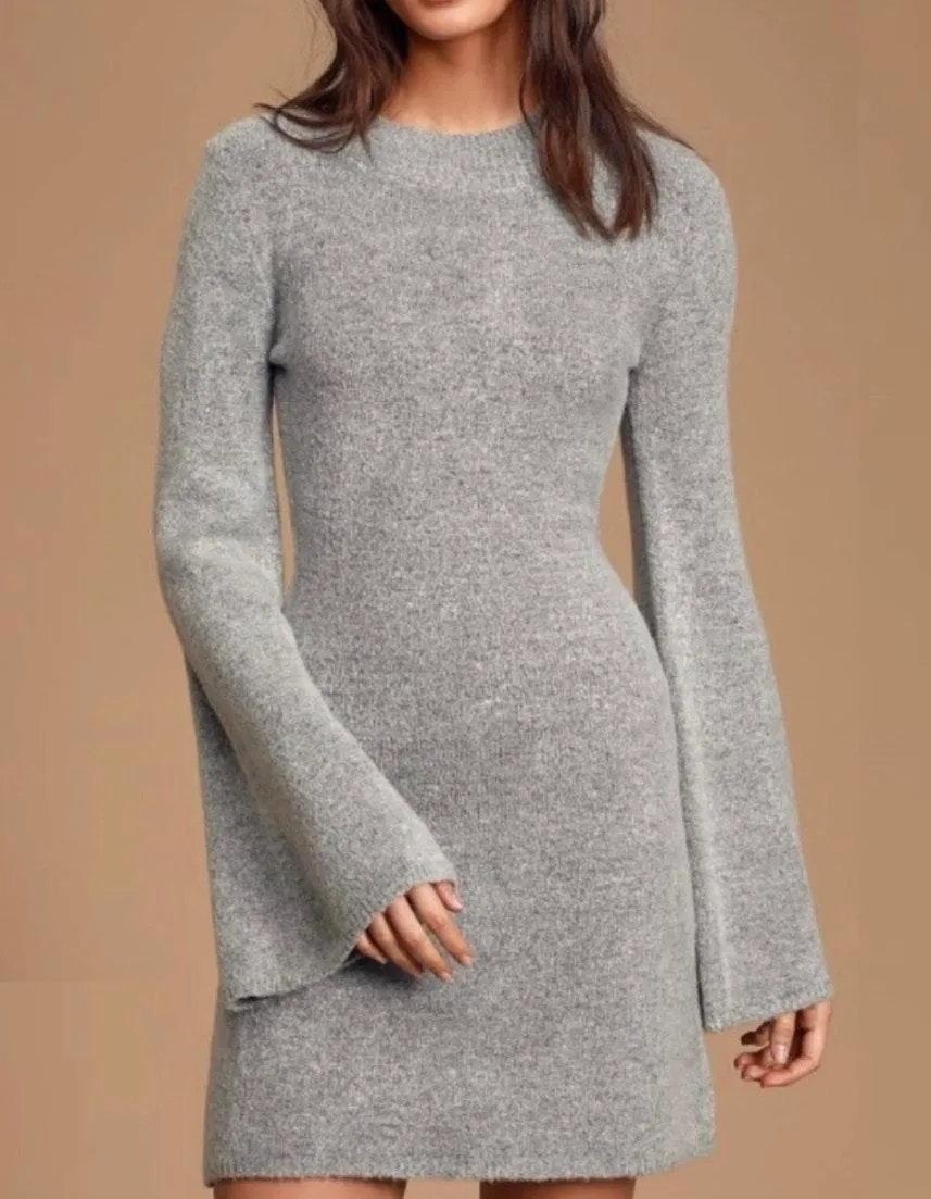 Lulus Chilly Days Heather Grey Knit Bell Sleeve Sweater Dress. Soft, medium-weight marled knit shape... Show more