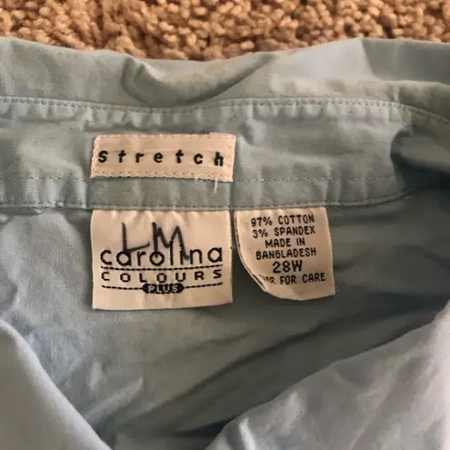 Short Sleeve Baby Blue Button Up Blouse Previously owned Has permanent marker on the size tag, has faded brown stains on it that I wasn’t able to get out (see last photo) otherwise great condition Size 28 in women Measurements in photos