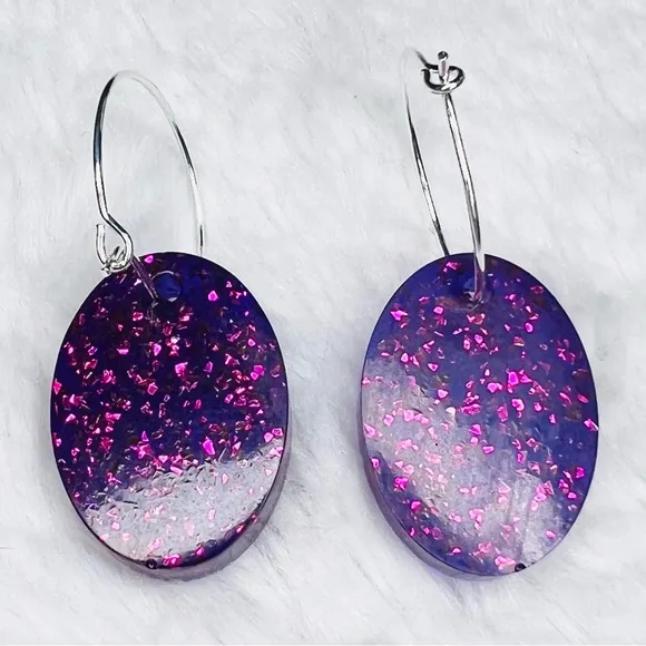 Handmade one of a kind pair of Purple Glitter Resin Oval Pendant Hoop Earrings! Featuring vibrant sp... Show more