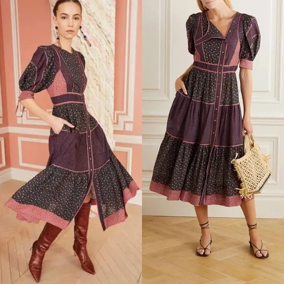 Ulla Johnson Verona Floral Patchwork A-Line Tiered Midi Dress. New with tags, never worn. DETAILS: • Size: 2 • Color: Multicolor (Pink, Red, Purple, Blue, Black, Green) • Features: lightweight, tiered skirt, contrast piping, pockets, asymmetrical front button closure, slightly flared cut, round neckline, elbow puffed bishop sleeves, fitted waist, viscose & cotton • Keywords: evening, date night, engagement, wedding guest, boho, bohemian, hippie, preppy, festival, party, anniversary, special occasion, event, romantic, feminine, prairie, influencer, blogger, girly, trendy, chic, spring, designer, fall, nature, earthy, farmhouse, worn by Mandy Moore & Ulla Johnson herself :) MEASUREMENTS: All measurements approximate laying flat: 16.5" bust, 47" length. *Product color may slightly vary due to lighting or monitor settings. Always open to offers & happy to answer any questions!* (500)