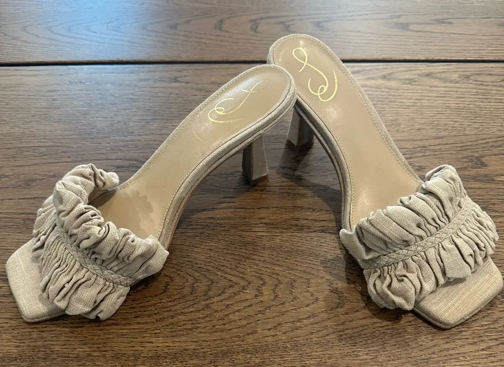 In EUC, no box included. Tags: neutral, comfortable, mules, kitten heels, canvas, coquette