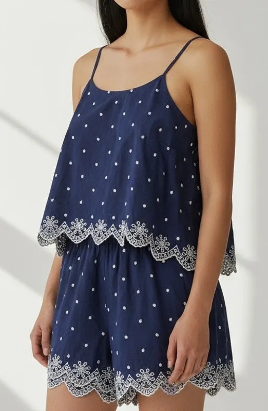 This Adore Me Luana set features a navy blue camisole with white lace trim and matching drawstring s... Show more