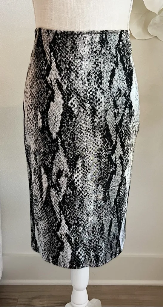 Chic St. John knit with a textured snake pattern. Ideal for a stylish ensemble. Size 4 Perfect Condition Slit on back APPROX MEASUREMENTS LAYING FLAT ARE WAIST 16” Hips 18” LENGTH 23” QUESTIONS? Leave a comment!