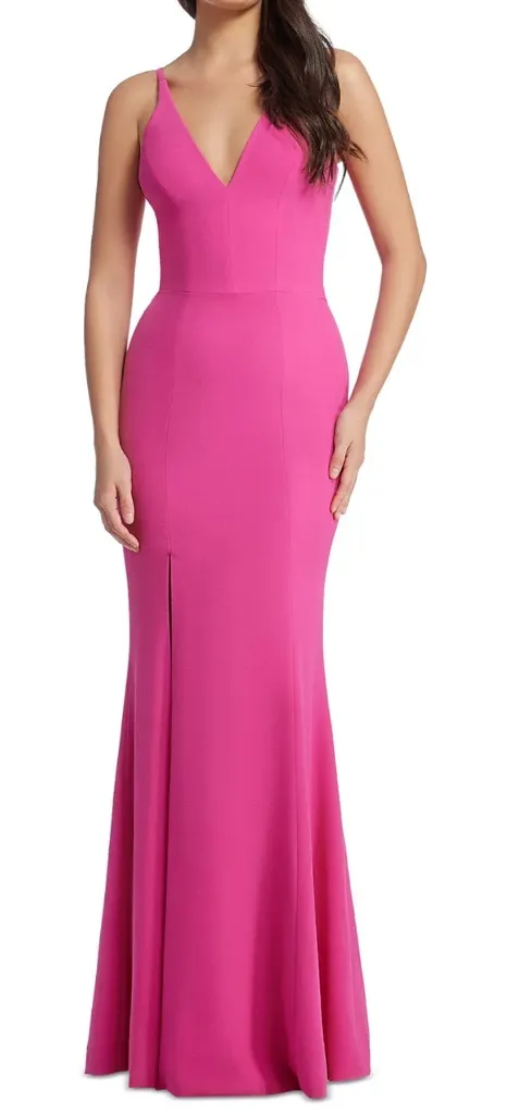 Color: Bright Fuchsia Size: M New with tags. In new condition. The Iris crepe gown is a stunning, body-hugging floor-length dress designed for special occasions. It features a plunging V-neckline and thin shoulder straps, creating an elegant, sleeveless look. The gown has a deep V-back and fits snugly through the bodice and hips, flowing into a full-length trumpet skirt with a dramatic thigh-high side slit. The concealed back zip with a hook closure ensures a seamless finish. Made from a lined crepe fabric, the dress is composed of 97% polyester and 3% spandex, offering both comfort and a flattering fit. Ideal for weddings and other special events. Approximate lay flat measurements: Waist: 14.5" Under arm to under arm: 16.5" Length from top shoulder: 60.5" ✨ A friendly note from my closet ✨ The item you see in the photos is the exact piece you’ll receive. None of my listings are thrifted—most are brand new with tags and in excellent condition. As a professional photographer, I make sure every photo is color-accurate and that each garment is displayed on a size-accurate dress form (for example, a size 10 dress is shown on a size 10–12 form for the most realistic look). I usually ship within 24 hours on weekdays. Wrinkles come free with shipping 😊 — a quick steam or press will bring your piece back to life.