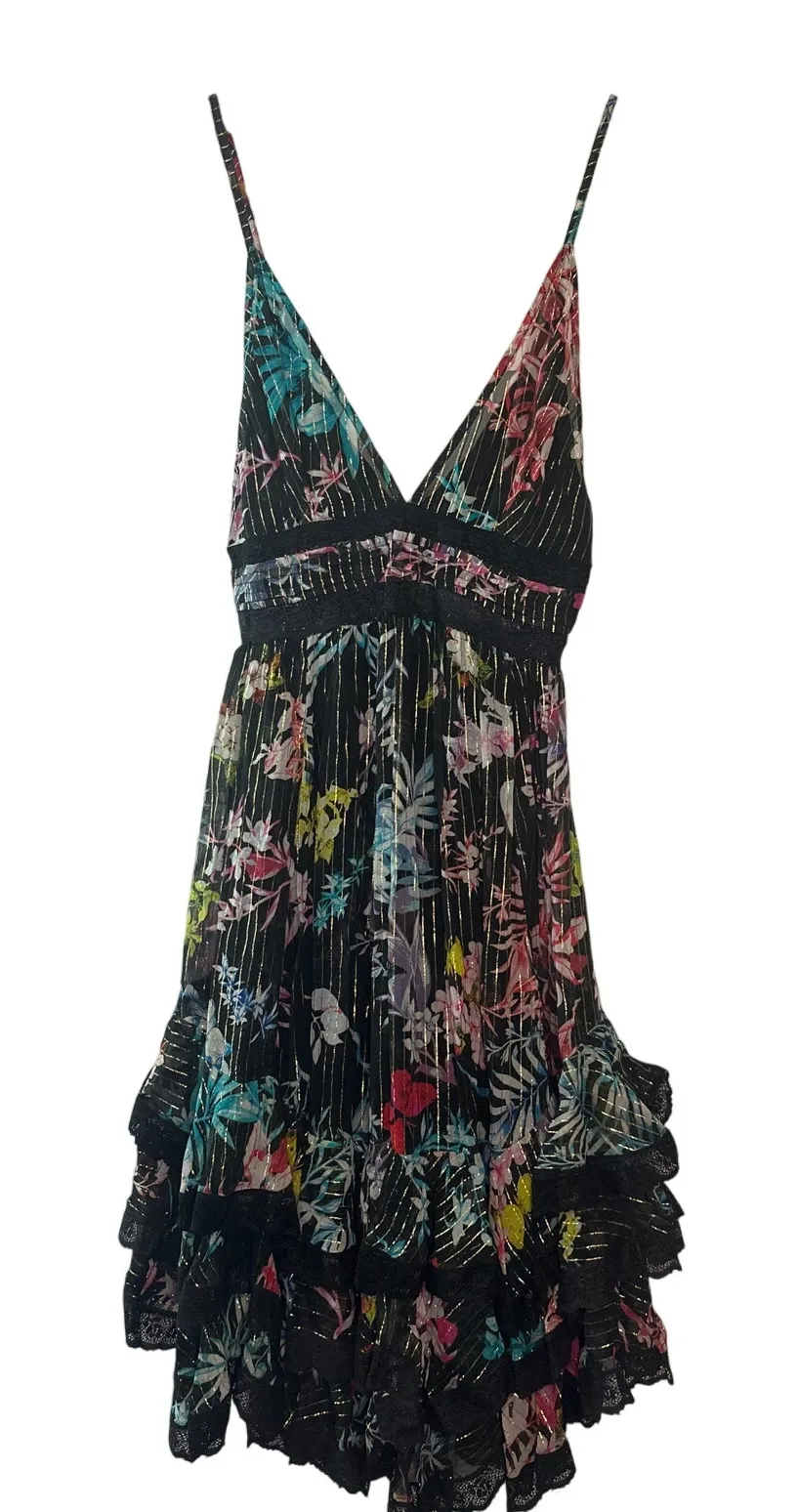 Turn heads in this stunning Rococo Sand Metallic Moonlight Mini Dress, crafted with feminine ruffles, bold floral print, and subtle gold metallic threading throughout. Style Details: • Deep V-neckline with adjustable spaghetti straps • Allover tropical floral print with gold metallic stripes • Black lace inset trim at waist and hemline • Tiered ruffled skirt with flouncy silhouette • Concealed back zipper closure • Fully lined Size: Small (S) • Approximate pit to pit: 14" • Length from V-neckline to longest hem: ~31" Fabric: 100% Viscose (shell & lining) Color: Black base with multicolor floral + metallic gold accents Condition: Excellent pre-owned condition, no flaws Perfect for parties, night out, or resort evenings. Fast shipping!