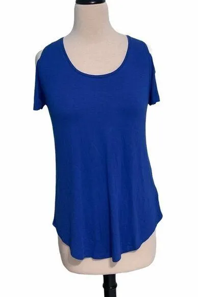 JM Collection Cold Shoulder Top Short Sleeves Blue Dragon Stretchy Scoop Neck XS Size: XS - extra small Condition: New with tags Features: Blue dragon color Cold shoulder Shirt, top Scoop neck T-shirt material Shoulder cutouts Short sleeves Material: 95% rayon 5% spandex Measurements: See photos for approximate measurements 0711