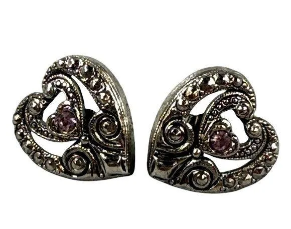 • Pierced Post • Intricate heart-shaped design • Accented with pink rhinestones • Silver-tone metal for a chic finish Slight tarnishing on metal; minimal wear visible. Please see photo's for measurements Previously worn condition. May have scratches or scuffs from previous wear and age. You may see reflections of the light setup in photos Size: Womens OS Condition: Pre-Owned Good good previously worn condition