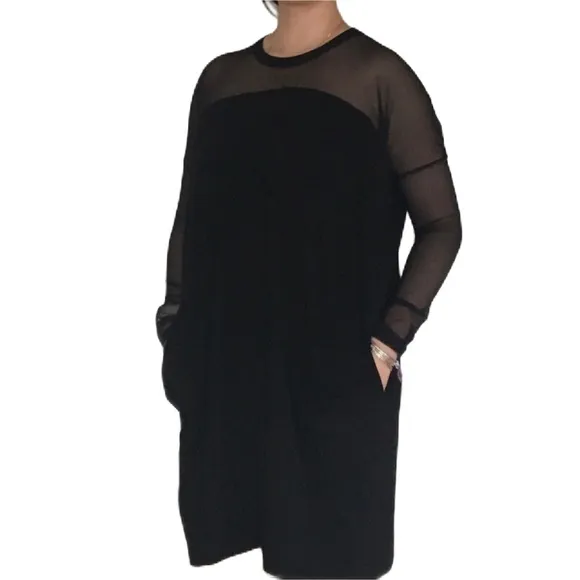 Super chic KAMALIKULTURE by Norma Kamali illusion top and sheer sleeves dress Hem on sleeves are raw Has two pockets Boxy shape but it drapes due to nature of fabric. Flat lay measurements: Length: 35” Chest: 26”