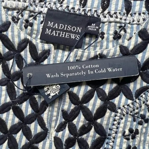 This blue and white striped dress from Madison Mathews is crafted from seersucker material with intricate embroidery detail and a notched round neckline. Size: Medium Color: Blue/Navy/White Short cap sleeve Stripes Embroidered 100% cotton Hand wash Pit to pit 22” Length 34” NWT - new with tag