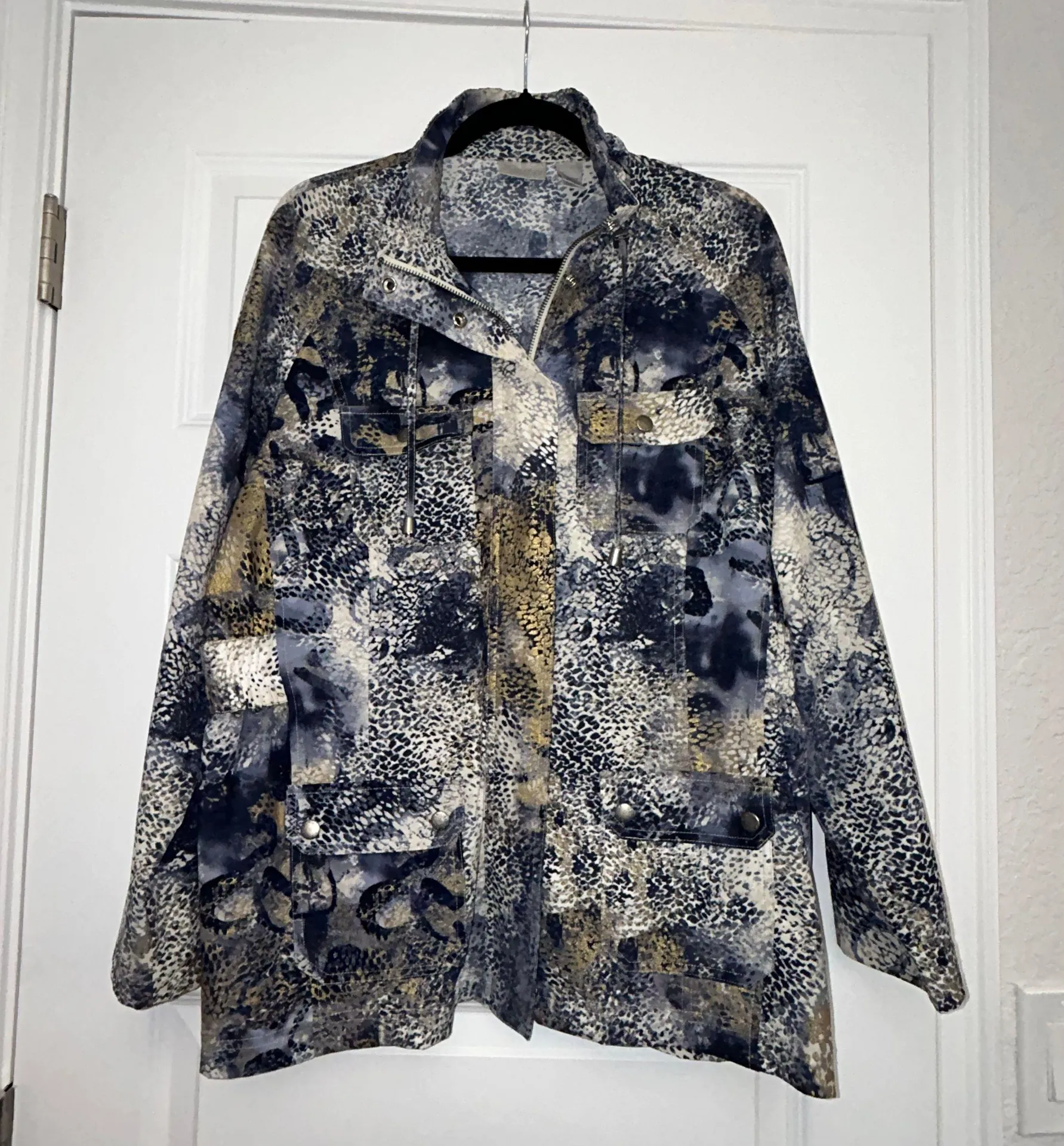 Chico’s Zenergy Zipper Front Lightweight Jacket Chicos Size XL Color Metallic Gold, Blue, White Snap... Show more