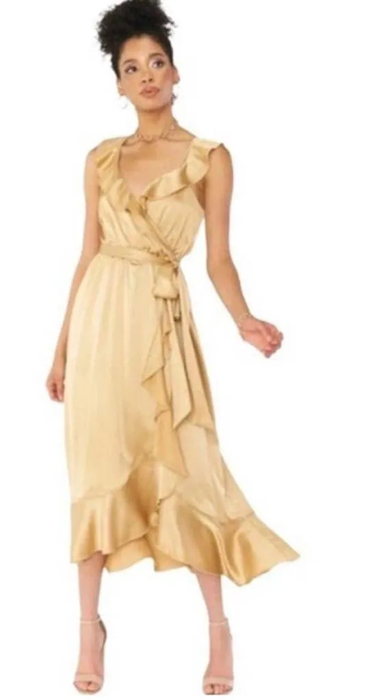 Extra Large. Show Me Your MuMu SMYM Samantha Ruffle Wrap Dress Bridesmaid True Gold Luxe Satin si... Show more