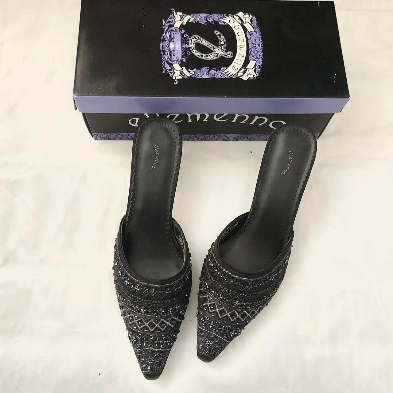 Vintage Ellemenno Romantic Coquette classy Black mules kitten heels pumps sequins & beading-genuine leather. Glamorous embellished pointed-toe sandals Used in Box-Women’s size 8 Approx 2” kitten heels Great for formal occasions & casual outings Comfortable &stylish #coquette #twee #fairycore #whimsygoth #goth
