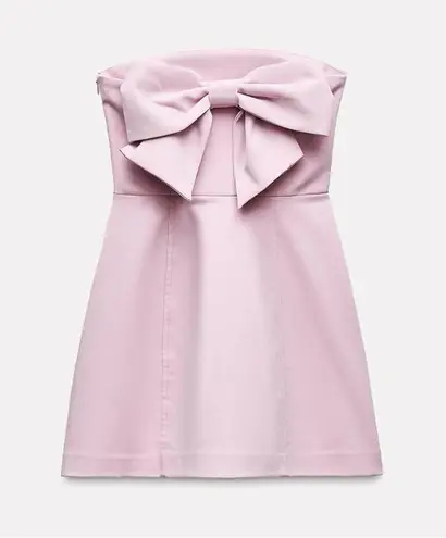 Strapless mini dress with straight neckline. Maxi bow detail at back. Interior lining. Side hidden i... Show more