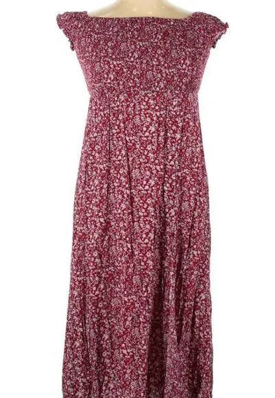 Red, casual dress, sleeveless, 100% rayon, mid calf length, boat neckline, floral print, stretchy bo... Show more