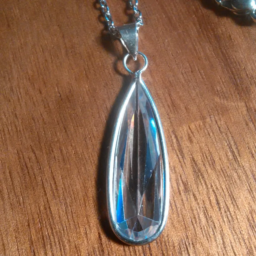 This pendant necklace features a white cubic zirconia stone with a beveled cut. The pendant is set in 925 sterling silver while the necklace chain is stainless steel. The necklace chain is approximately 20 inches in length. 17.00 ctw. Brand new. B17