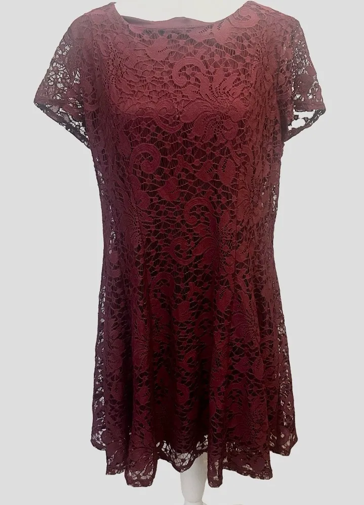 Vintage Burgundy Lace Layered Whimsigoth Fairy Grunge Dress Sz 14 Y2K Maroon Wine Zipper Back Machine Washable #fitandflare #feminine #fairy #whimsigoth #oxblood #burgundy #maroon #party #hoco #lace #fairygrunge #coquette
