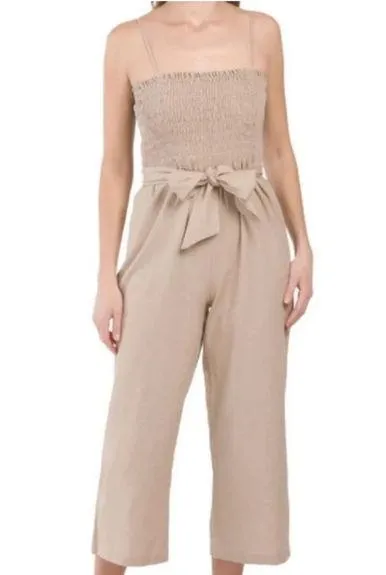 House of Harlow 1960 Linen Blend Cropped Jumpsuit Size Medium Sand (Tan) color The perfect summer jumpsuit by House of Harlow 1960 features a smocked & ruched bodice with adjustable shoulder straps. A wide fabric belt cinches the waist to feature the wide cropped pants. The linen/rayon blend makes this jumpsuit comfortable, breathable & packable--perfect for any occasion! Fabric belt & belt loops Pockets Adjustable straps Wide leg Excellent preowned condition