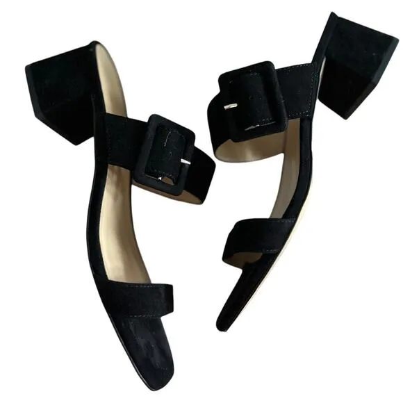 Excellent, like new condition. Black suede upper, slip-on. Low chunky heel, square toe. Two straps w... Show more
