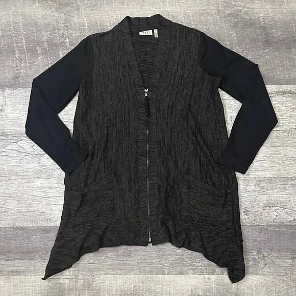 Lori Goldstein Heathered Grey Zip Up Cardigan This lightweight zip up cardigan sweater is super soft and cozy. An asymmetrical hemline adds an artsy boho flair. Patch front pockets and contrasting sleeves finish off the details. This knit jacket works for the office or a weekend casual vibe. - Fill Zip Front - Front patch pockets - Contrasting sleeve color and texture - Asymmetrical hem - Black and Melange Marled Dark Gray - 85% Polyester / 10% Rayon / 5% Spandex - Machine Washable SIZE: Tagged Womens XXS, but fits XS/S, depending on your fit. Please refer to measurements. CHEST underarm to underarm: approx. 18.5” LENGTH shoulder to hem: approx. (S) 28” / (L) 34” SLEEVE shoulder seam to cuff: approx. 21” PRE-OWNED: Very Good Condition. No visible flaws. Refer to photos for condition details. 2120-13-01