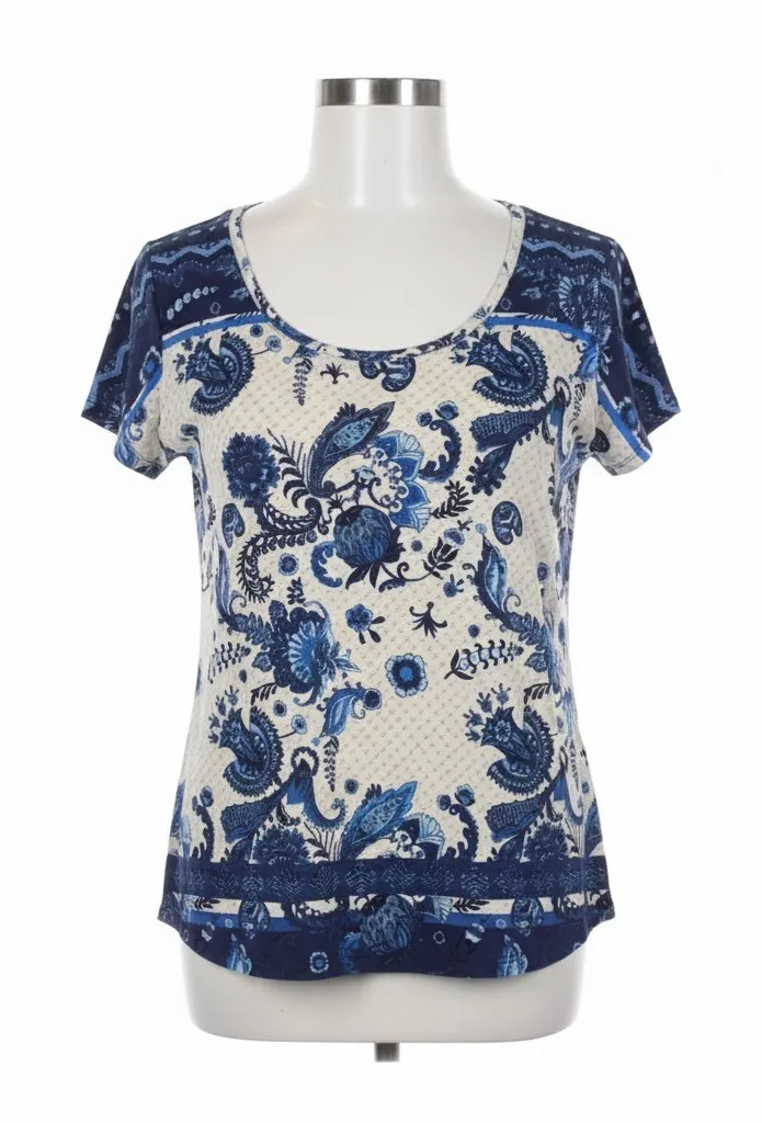 Type: Blouse Department: Women Style: Basic Material: Viscose, Elastane Neckline: Scoop Neck Sleeve Length: Short Sleeve Sleeve Type: Casual Sleeve Pattern: Floral Fit: Regular Bohemian, boho, maximalist, artistic, vibrant, colorful, unique, pattern, print, paisley, floral, botanical, tapestry, bandana, resort, travel, vacation, cottagecore, Mediterranean, eclectic, abstract, graphic, groovy, retro, stretch, comfy, soft, summer, spring Measurements are Approximate: Length 24" Armpit to Armpit 18" Pre-owned in excellent condition unless otherwise stated. Please see photos for measurements, condition and details. All items are shipped promptly.(7370)