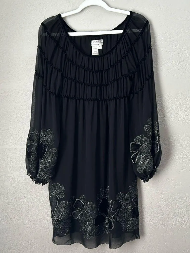 MSSP Max Studio Size M Black Shift Dress With Metallic and Velvet Floral Embellishments Sheer Ballon... Show more