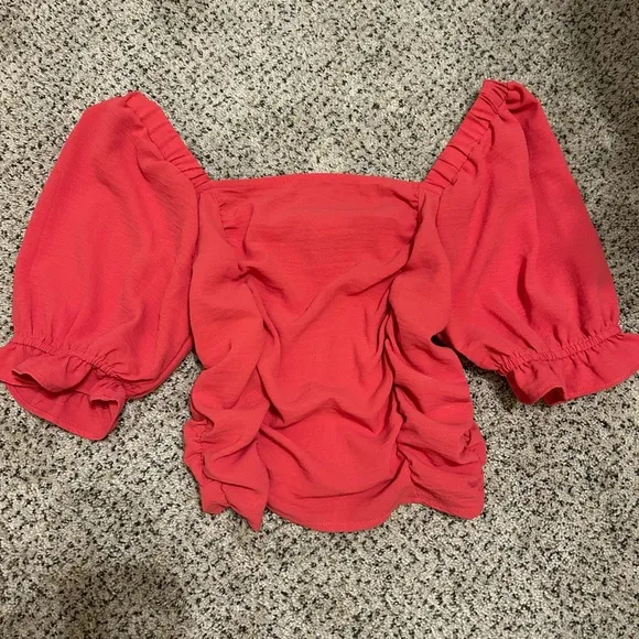 This vibrant red blouse from Altar'd State features elegant puff sleeves and a ruched front, adding... Show more