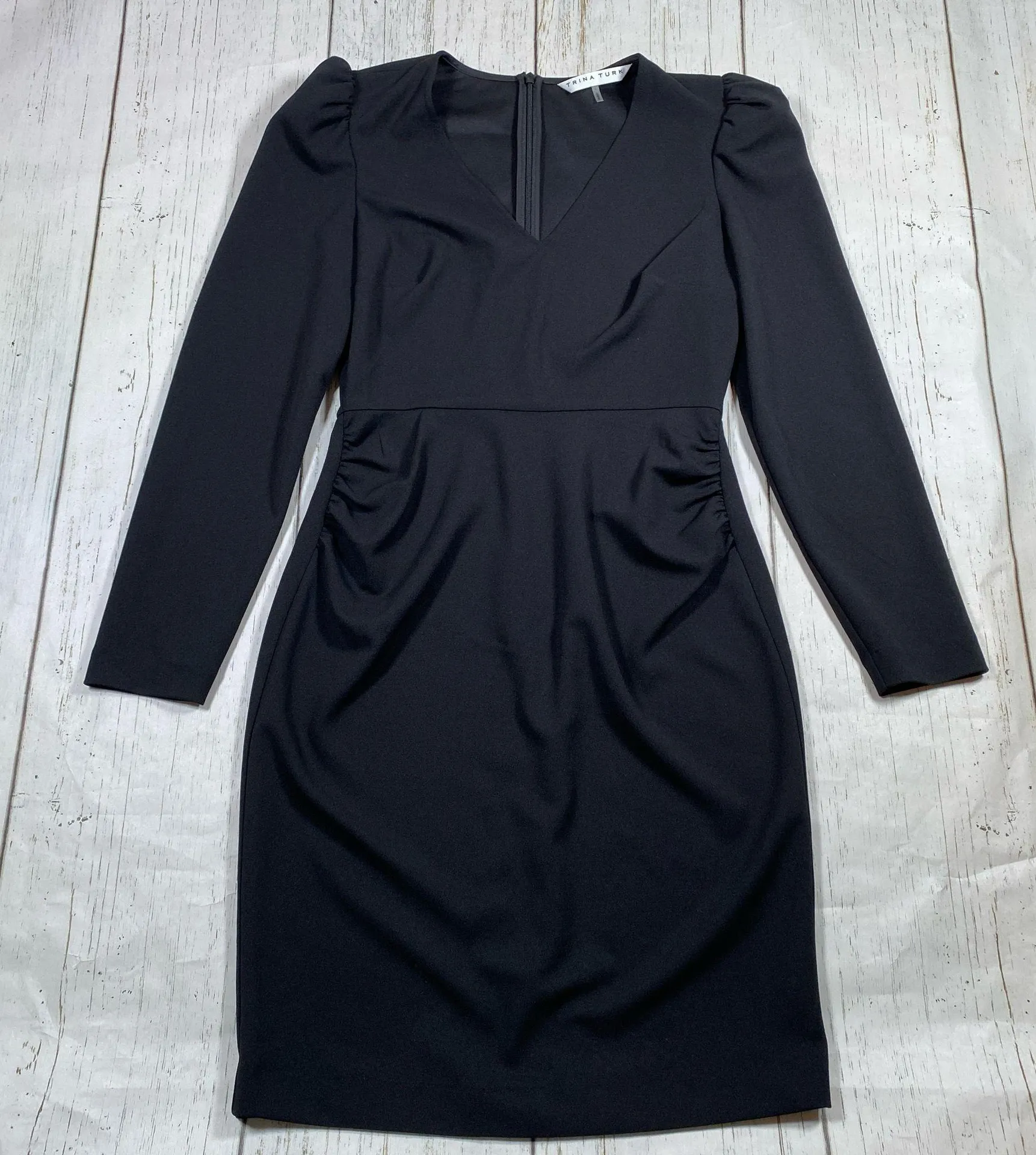 Size 6. Trina Turk Puff Shoulder Long Sleeve Sheath Dress in black. Dress features v-neck, structure... Show more