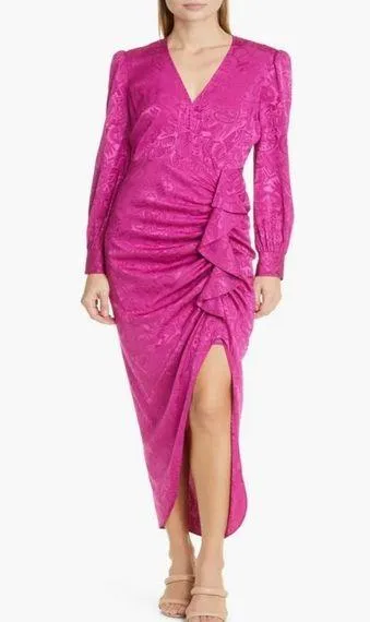 Get noticed in this vibrant silk-blend maxi designed in a satiny paisley jacquard with a ruffled side and a stem-showing slit. 52" length (size 8) Surplice V-neck Long sleeves 52% silk, 40% viscose, 8% spandex Machine wash, line dry Imported