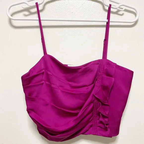 Features: Elegant spaghetti strap top with ruched bodice and side ruffle. A modern ruffle trim adds a flirty style to this cropped camisole with removable spaghetti straps. Straight neckline, square neck, side zipper closure, asymmetrical hem Size: 2 Condition: Excellent Tags: Trendy, preppy, dressy, spring, summer Measurements are approximate & taken while lying flat: *Length: 9" *Pit to Pit: 15.5" -No trades, no modeling, offers welcomed :) Thriftandsip