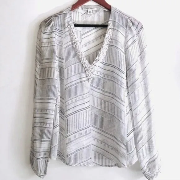 Long sleeve beaded and printed sheer crepe silk v-neck peasant top from Banana Republic. Size XS Bl... Show more