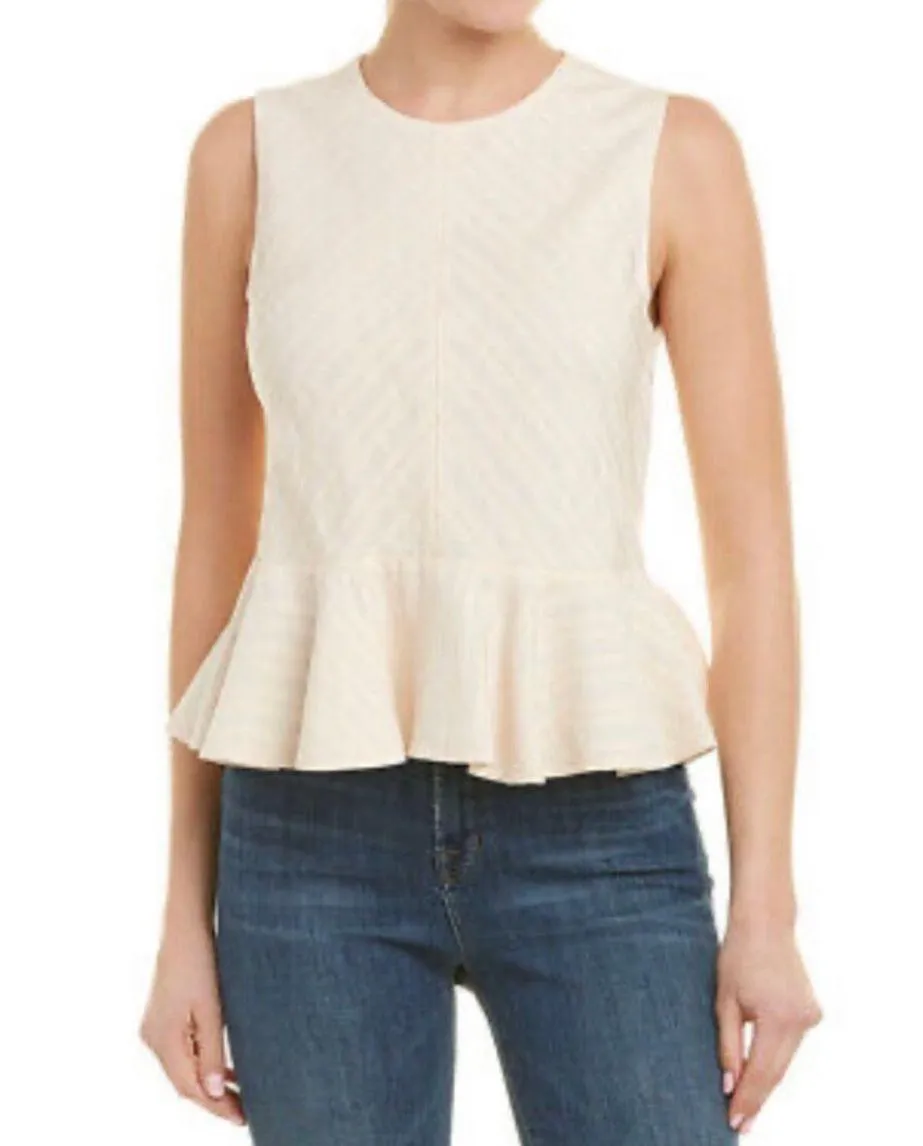 A wardrobe-staple top gets a feminine upgrade with a ruffled peplum that keeps its flounce in a crisp linen blend textured with stripes. Hidden back-zip closure - Jewel neck - Sleeveless- Dry clean. Perfect for the office or wear with jeans. Peplum is coming back big time don’t let this get away. Fabric: 53% Linen/ 39% Lyocel/ 8% Cupro Pit 2 Pit- 16 inches Shoulder seam to hem- 20 inches Color- Cream- Labeled Crème Brûlée