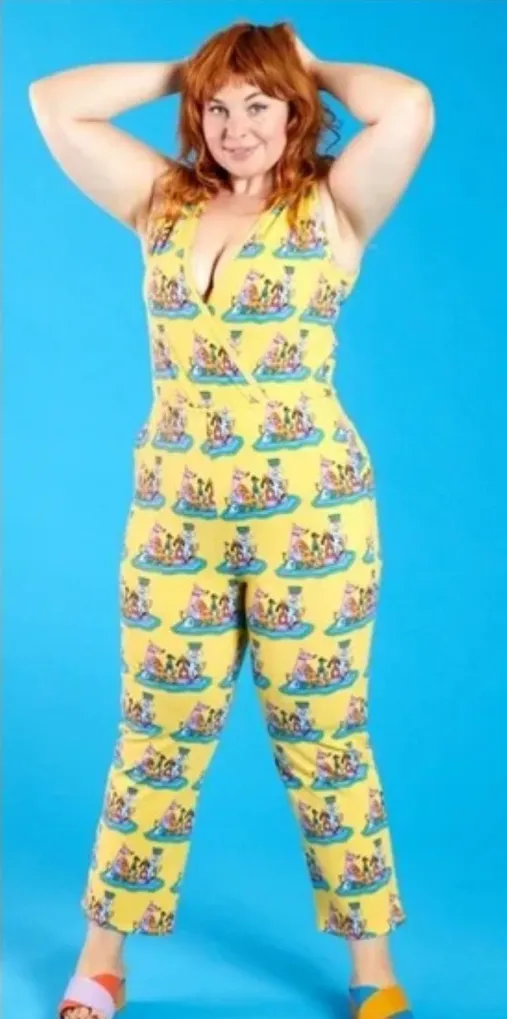 Rare Nooworks Sonny Suit one-piece jumpsuit in a yellow "Dog Party” size 4X In great Preowned Condition Made in the USA bright yellow Dog party print novelty Straight leg Sleeveless V-neck Surplice top