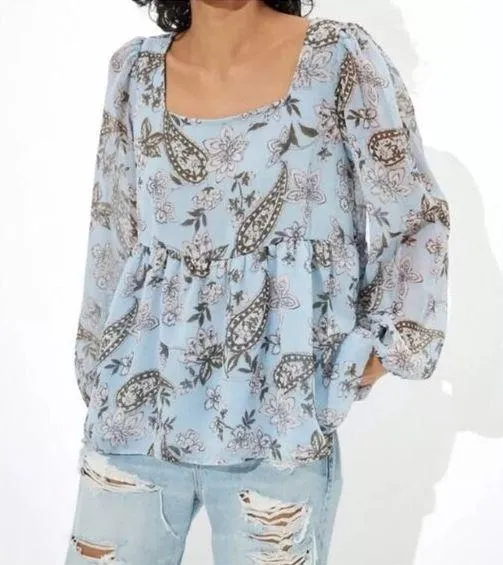 American Eagle Light Blue Beige Floral Paisley Chiffon Tie Back Blouse Brand new without tags, Gorge... Show more