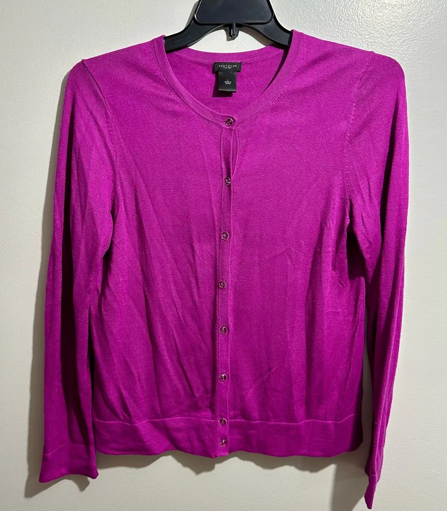 Elegant pink cardigan. Button-up front. Long sleeves. Soft and stylish.