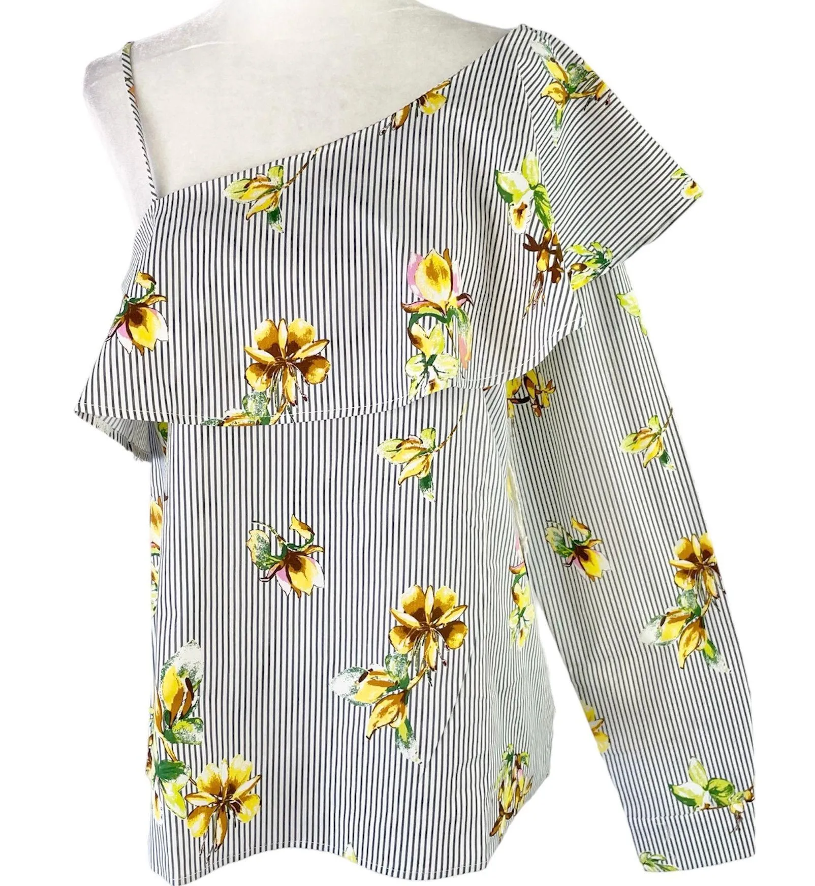 Lumiere stripe floral print ruffled one shoulder long sleeve top. One shoulder neckline. Long sleeve with button cuff on the wearer's left side. Adjustable spaghetti strap on wearer's right side. Ruffle overlay around the top. Straight hem. Unlined. Woven fabrication. Material: 97% cotton 3% spandex. Gray and white stripes with yellow flowers. Brand: Lumière Style: NT17527 Color: Grey Multi Size: S small Condition: NWT new with tags Approximate measurements laying flat: Pit to pit 17.5" Length 23.5" Style: 1 Shoulder, Off The Shoulder, Shoulder Strap, Striped Shirt, Floral Shirt, Spring Blouse, Summer, Pop of Color, Colorful, Multicolor, Bright, Fun, Favorite, Going Out, Weekend Wardrobe, Dress Up or Down, Casual, Daytime, Crisp, Cotton Blend, Pattern Mix