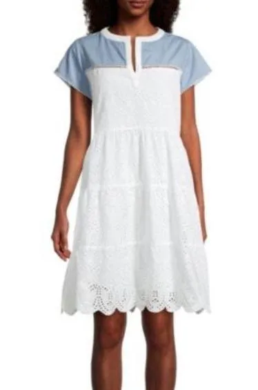 Size: M NWT $158 Cap sleeves shift dress with an eyelet lace fabrication and contrasting yoke. Pullover styling Split neckline Short cap sleeves Cotton Approx Measurments: 18.5” armpit to armpit 39” length 072222