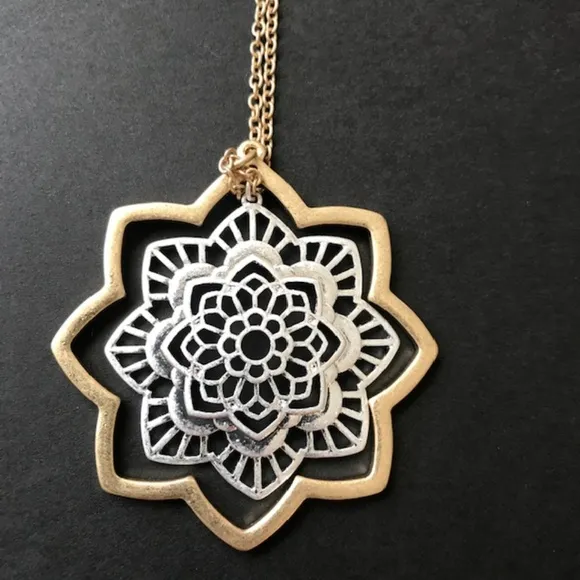 Open Cut Floral Shaped Pendant on 30" Chain Brand New Made of triple plated silver & gold plate Has a worn metal look..so pretty Pendant measures 2" x 2" Inner pendant turns with movement Chain is 30" L & has a 3" extender for flexibility in wear & also has a worn metal look Nickel & lead free Will be packaged well for safe travels in a cotton lined jewelry box..perfect for storing, gift giving