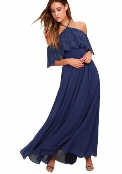 NWT Lulus Exclusive! The Unmatched Beauty Navy Blue Lace Off-the-Shoulder Dress is becoming an inte... Show more