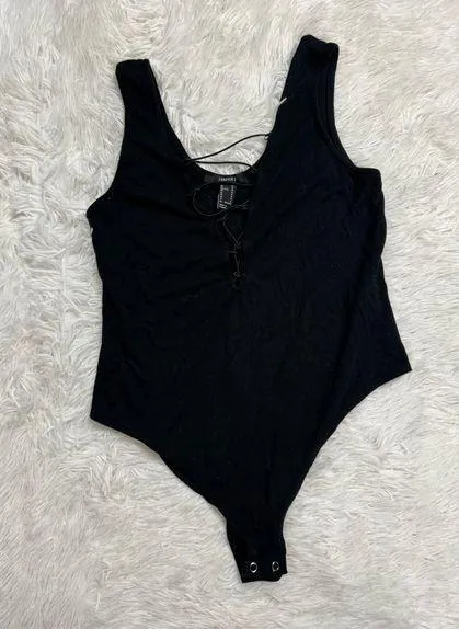 forever 21 ribbed bodysuit open front style clasps at bottom ties on front are stretchy thicker... Show more